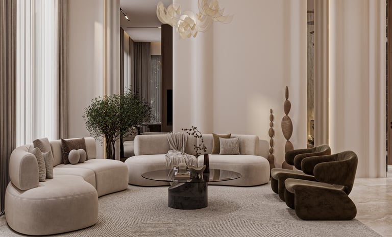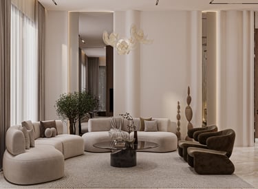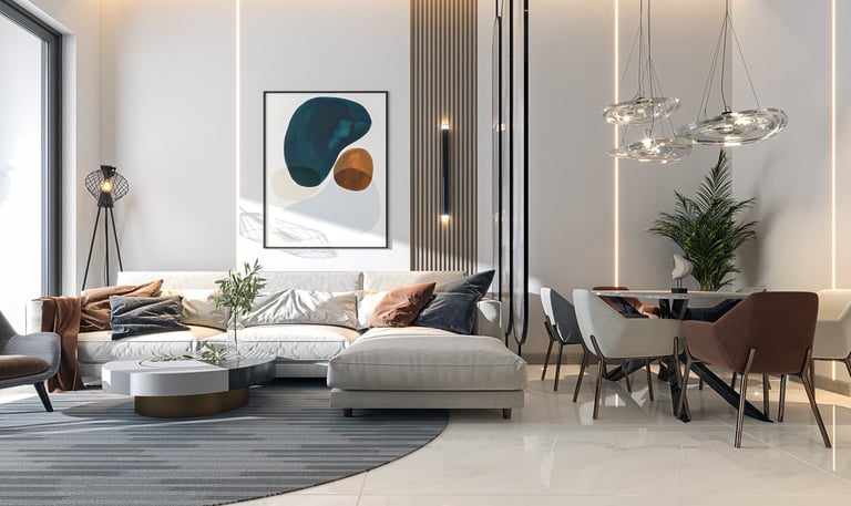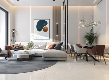 تصميم شقة خاصة يعكس أسلوباً عصرياً راقياً يجمع بين الصالة والمطبخ بتفاصيل فاخرة ويعكس هوية أوك هوم