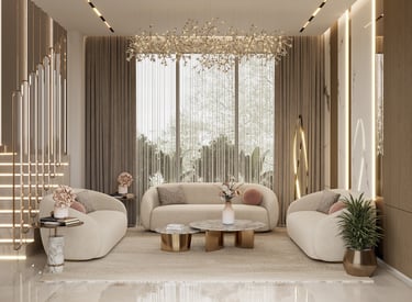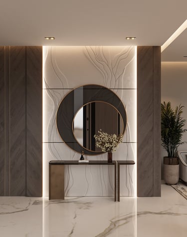 صالة استقبال بتصميم مودرن فاخر، تجمع بين الرخام الأبيض والإضاءة المخفية مع لمسات ذهبية راقية، وأثاث ناعم بلون بيج يضيف أجواء دافئة وأنيقة , يعكس هوية أوك هوم