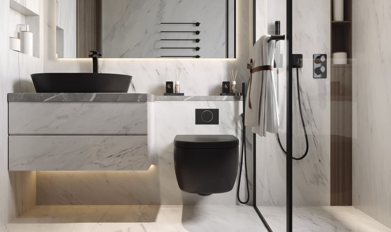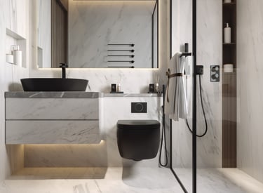 تصميم يجمع بين العملية والأناقة لخلق تجربة فاخرة في دورة المياه , يعكس هوية أوك هوم