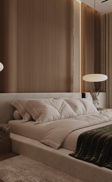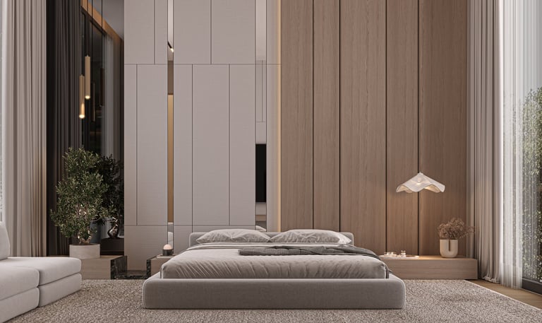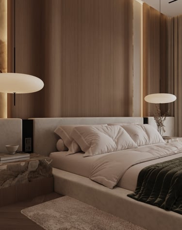 تصميم غرفة نوم رئيسية مودرن بلمسات خشبية وإضاءة مخفية، يجمع بين الراحة والفخامة من أعمال شركة أوك هوم