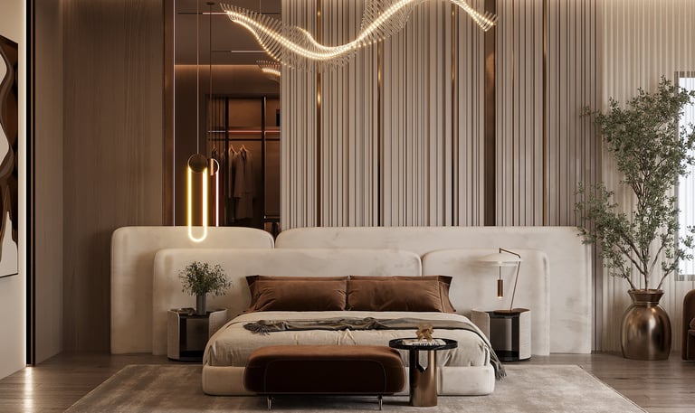 تصميم غرفة نوم رئيسية يجمع بين الأناقة العصرية والدفء، مع غرفة ملابس فاخرة ولمسات إضاءة حديثة , من أعمال أوك هوم.