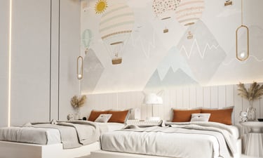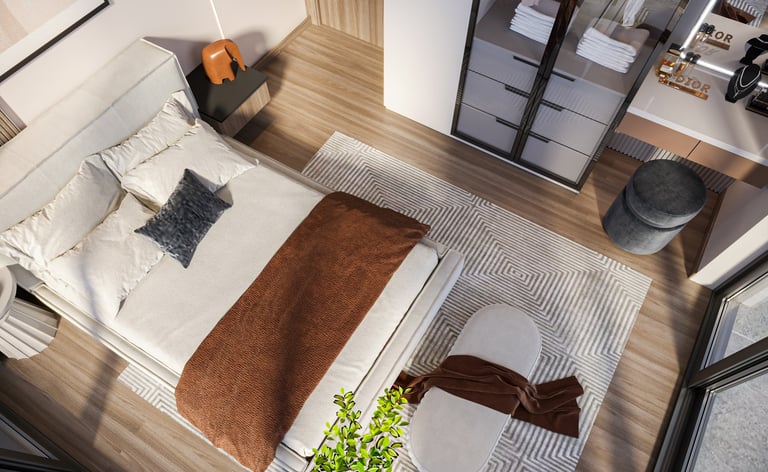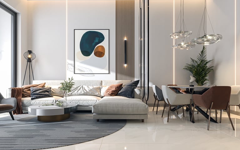 A private apartment design that reflects a refined modern style, blending the living room and kitchen with luxurious details, while embodying Oak Home identity.