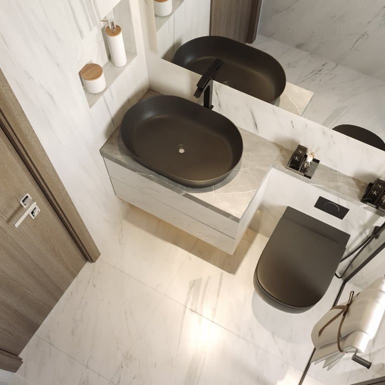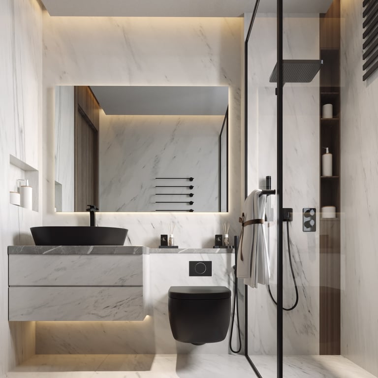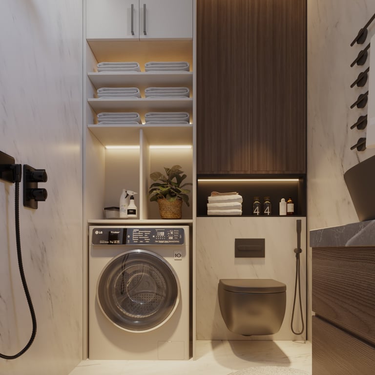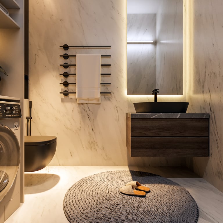 إحدى تصاميمنا تصميم راقٍ لدورة مياه مع ركن غسيل