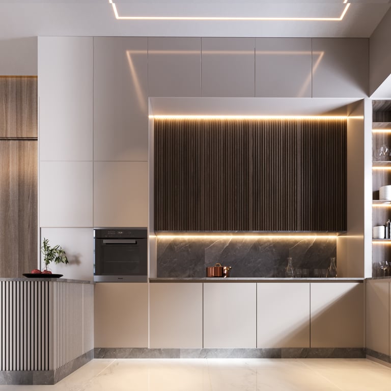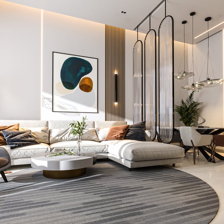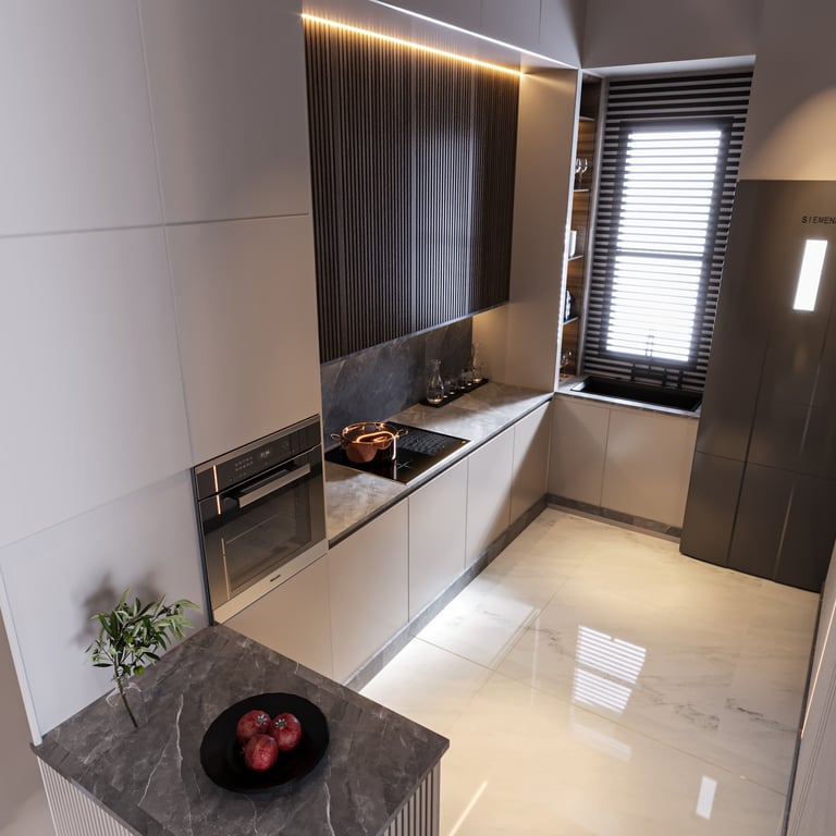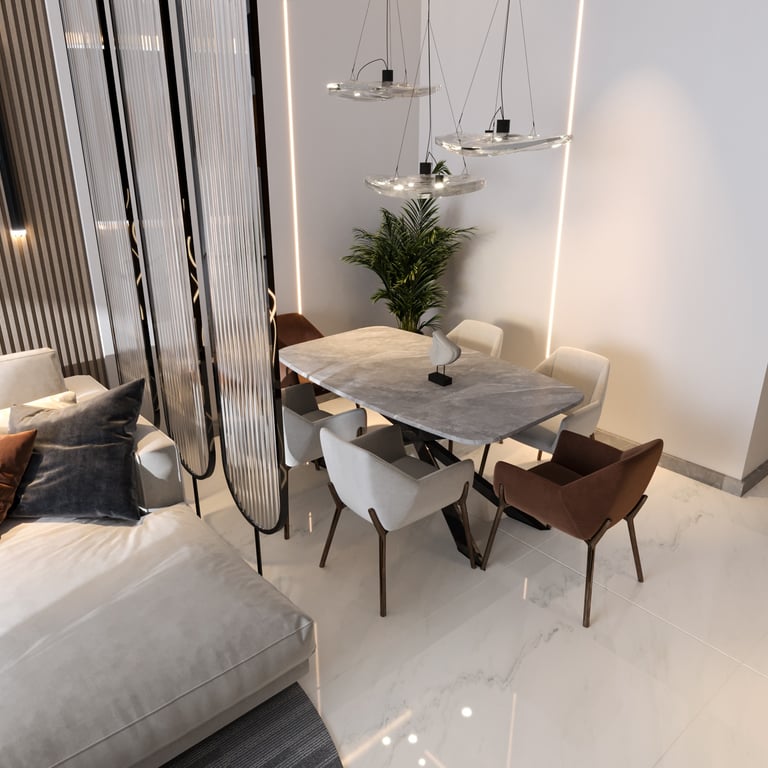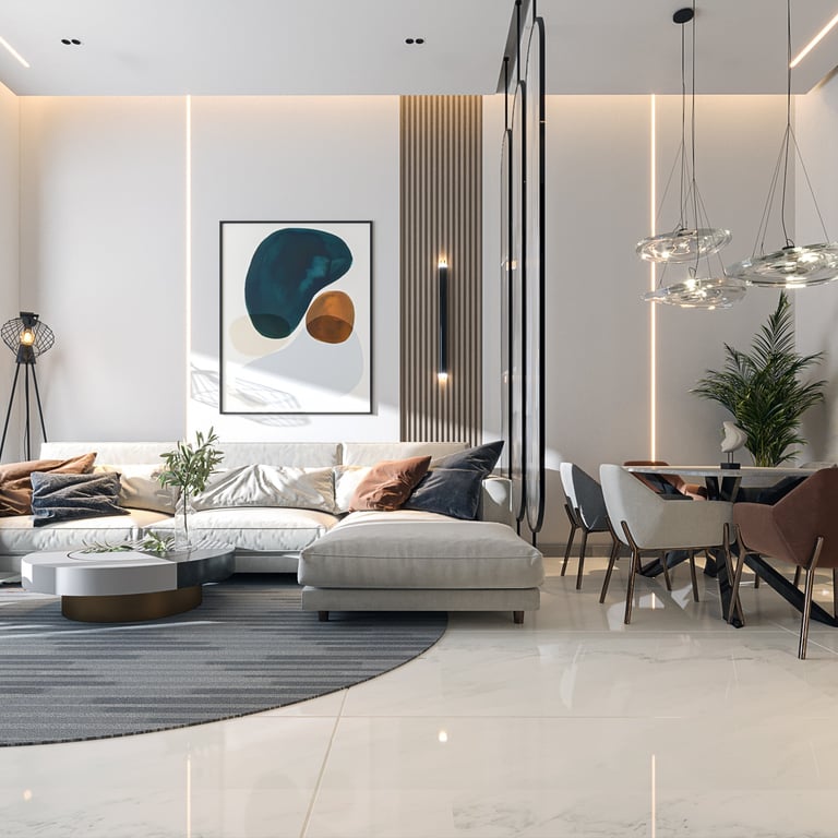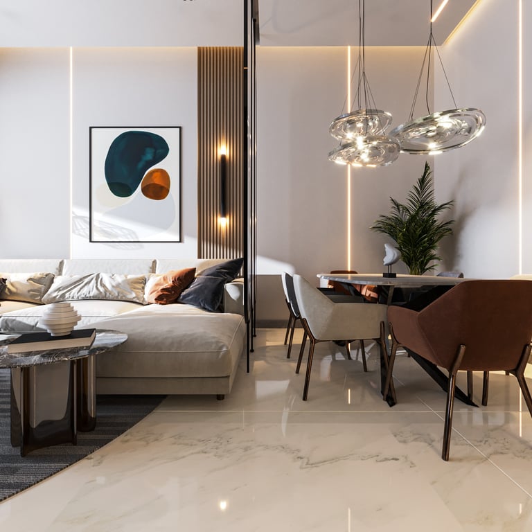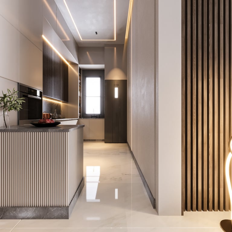 تصميم شقة أنيقة مع صالة ومطبخ حديث